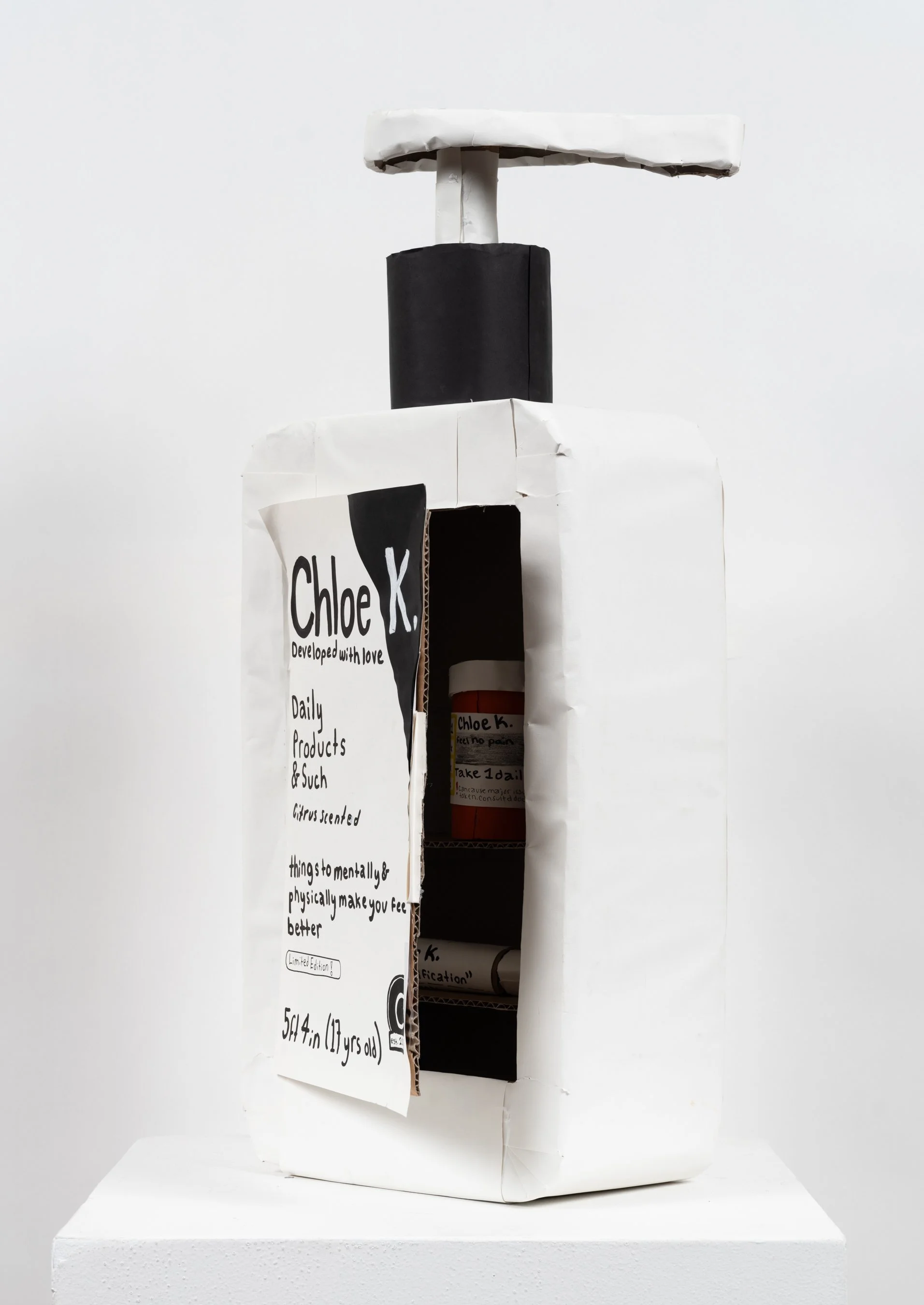 I was prompted in a sculpture class to recreate an everyday object and change one aspect. I immediately thought of my lotion bottle, sitting on my desk, and knew I wanted to make a massive version. Through spending so much time looking at the bottle, and my interrogative nature of looking at the world, I became inspired to play around with the writing on the product. I’ve been interested in product design for a while, particularly what is highlighted and what isn’t. The lotion bottle inspired me so much that I created two more products, and I plan to make more in the coming months. These products are in a way a self portrait, and reflect how I perceive